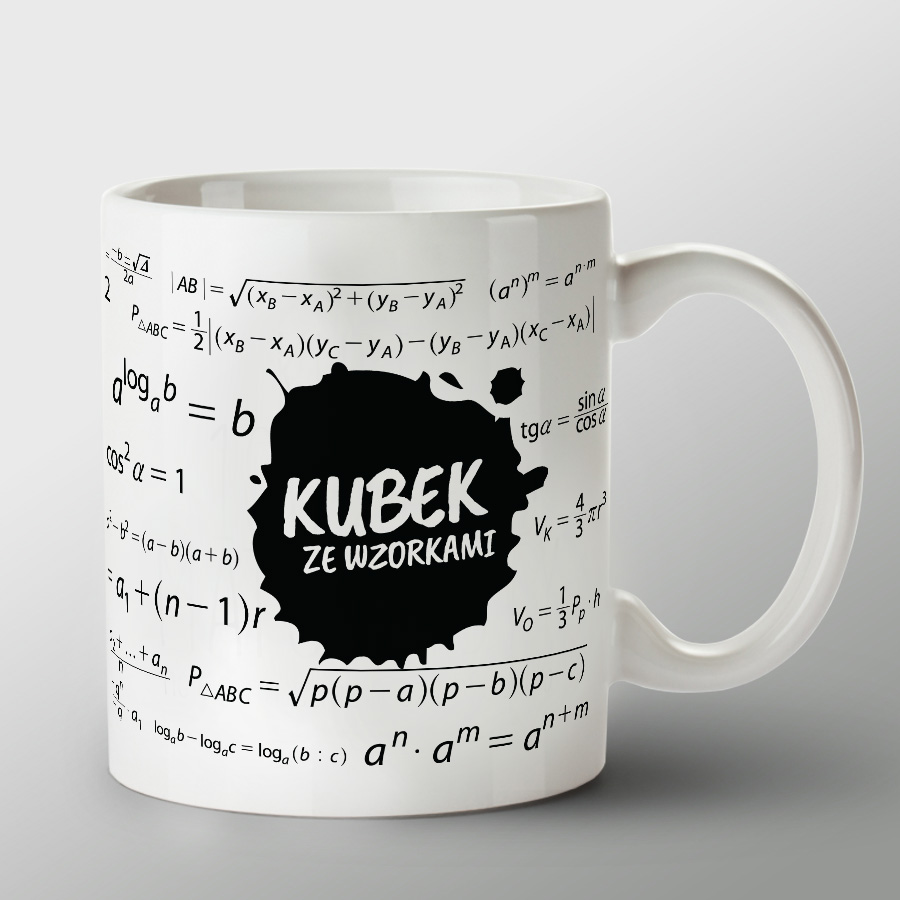 KUBEK porcelanowy z nadrukiem „KUBEK ZE WZORKAMI"i wzorami matematycznymi
