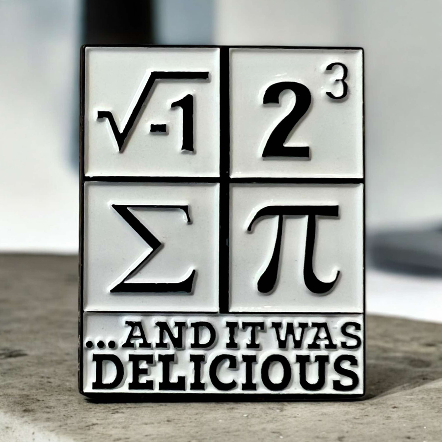 Przypinka matematyczna z symbolami √-1, 2³, Σ, π