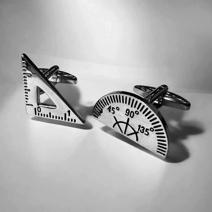 Spinki do mankietów w kształcie ekierki i kątomierza